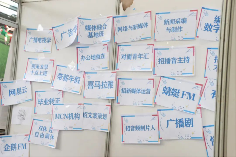 时代是在不停变化的,现在的大多数企业也开始在慢慢迎合年轻人的思想,今天在招聘会上有很多新潮企业,改变了以往的严肃问答的面试模式,而是采用小弹幕的方式,在介绍板上贴着“网易云”、“别来太早,十点上班”、“撕一张,来呀 撕鸭”等充满青春活力的标语来吸引求职青年,为整个招聘会现场带来许多活力。
