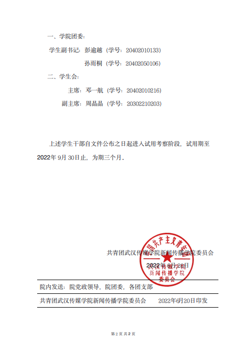 上述学生干部自文件公布之日起进入试用考察阶段,试用期至2022年9月30日止,为期三个月。