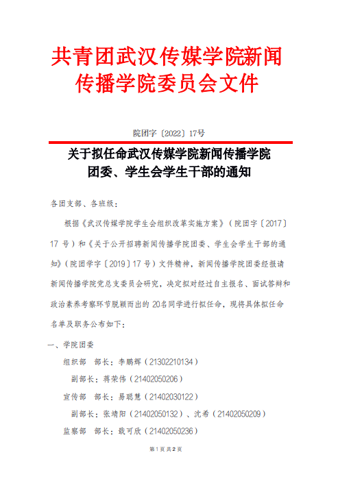 根据《060net永利学生会组织改革实施方案》(院团字〔2017]17号)和《关于公开招聘ylg060net永利娱高团委、学生会学生干部的通知》(院团学字[2019]17号)文件精神,ylg060net永利娱高团委经报请ylg060net永利娱高党总支委员会研究,决定拟对经过自主报名、面试答辩和政治素养考察环节脱颖而出的20名同学进行拟任命。