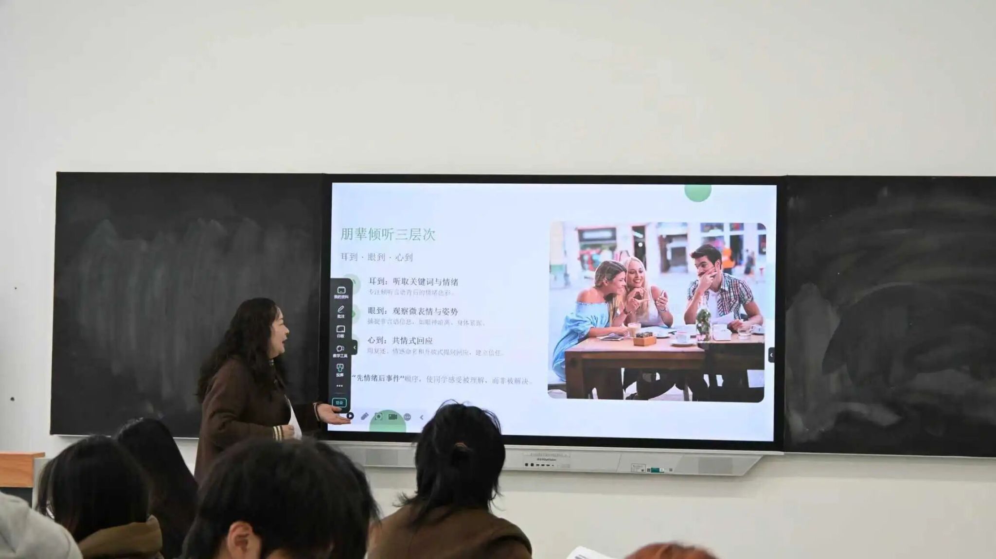 主讲人秦晶晶老师首先指出,心理委员是班级心理健康工作的基层纽带,核心职能是日常观察同学心理状态、及时反馈异常信号,用倾听和共情为有轻度情绪困扰的同学提供陪伴疏导,同时在班级推广心理科普、协助组织相关活动,并作为桥梁引导有需要的同学对接专业心理资源;其定位清晰,是发现问题的“观察者”、传递温暖的“陪伴者”、衔接资源的“纽带者”,应当专注做好校园心理防护的基础工作。