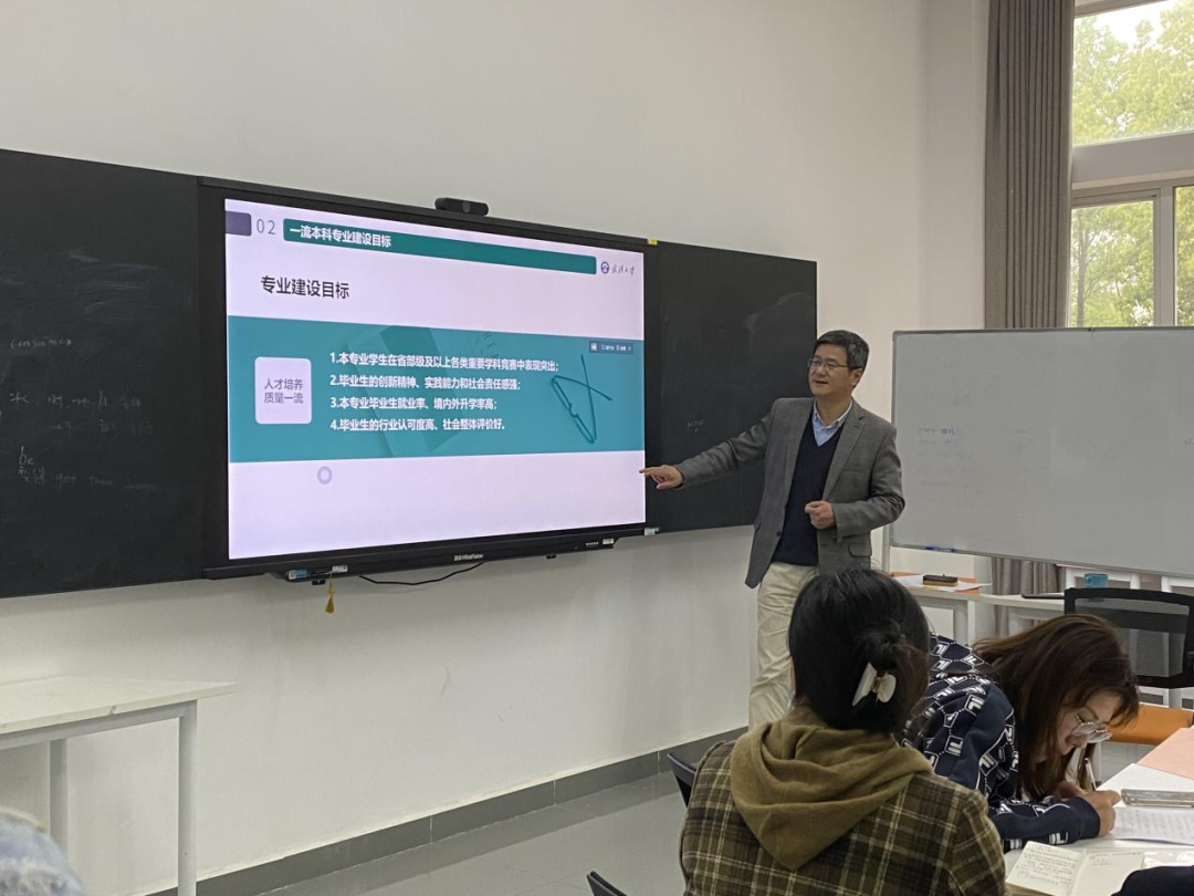 接着,他分析了一流本科专业的建设路径,多次举例讲解课程思政建设的重要性,并强调把课程思想政治教育贯穿人才培养体系,加强学生认知社会实践,开拓学生眼界。