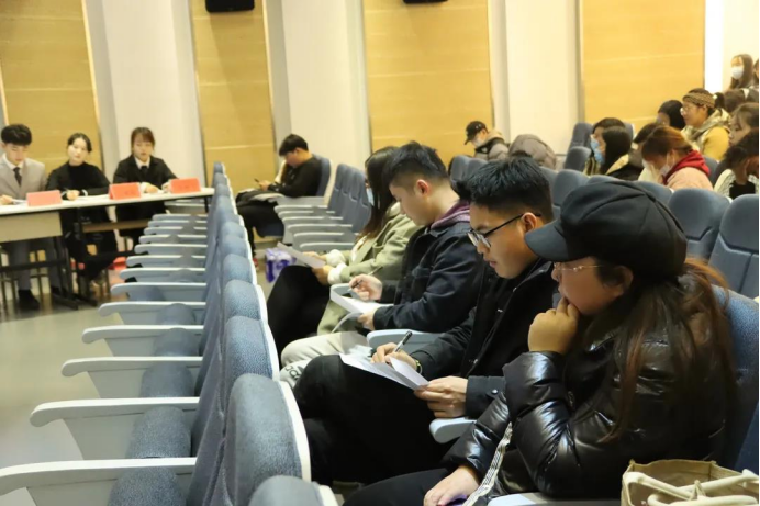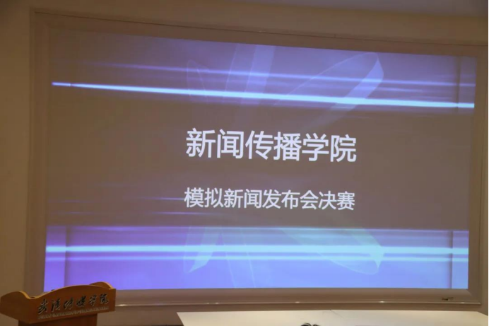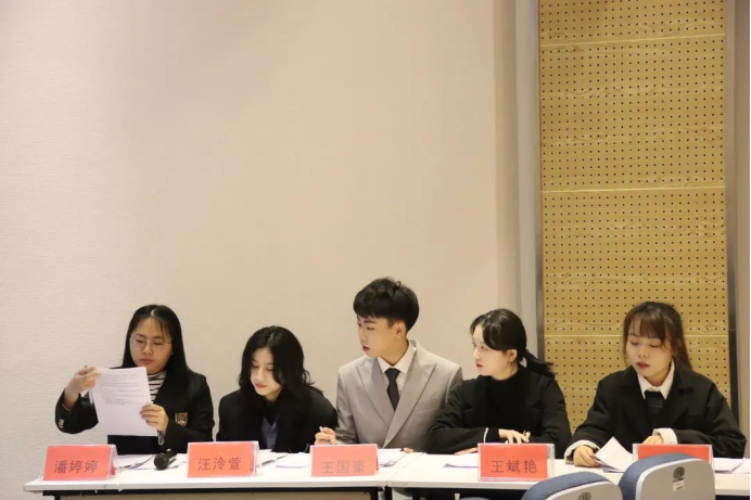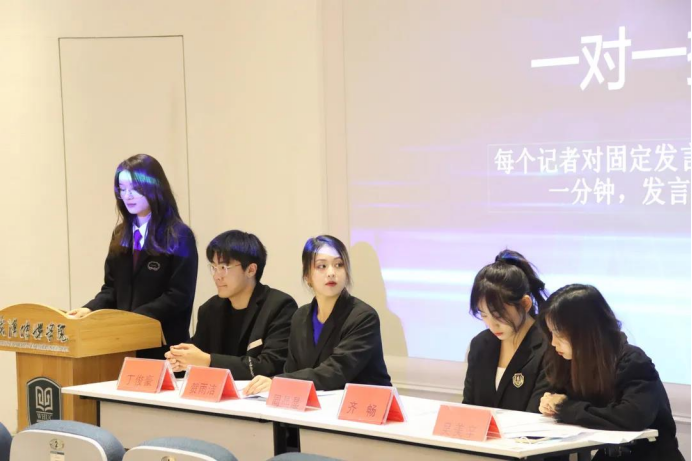 本次模拟新闻发布会决赛于2021年12月8在3101展开。比赛开始前主持人李嘉怡同学向我们介绍了本次活动的规则并公布了评委团,他们分别是学生科科长秦晶晶、马旻老师和王文琦老师.