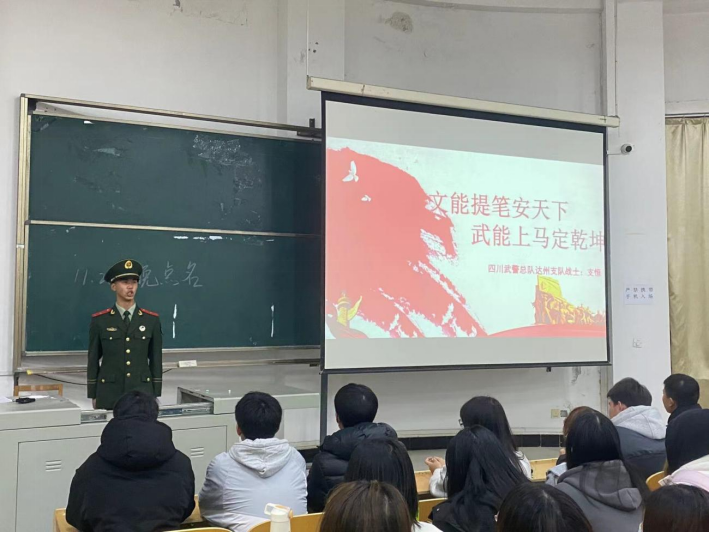 为宣传国家征兵政策,鼓励热血青年学子应征入伍,报效祖国。11月28日晚20:00在3201教室21级新闻采编与制作全体学生参与了学校的征兵宣讲工作。原四川武警总队达州支队下士,现060net永利学生支恒为大家讲述武警支队的精彩生活。积极鼓励学生参军报国,他谈到“文能提笔安天下,武能策马定乾坤。”倡导学生参军报国,强身健体,为大家讲解了军队政策,着重从入伍政策、军队待遇、未来发展几个方面给同学们做了全面的讲解。