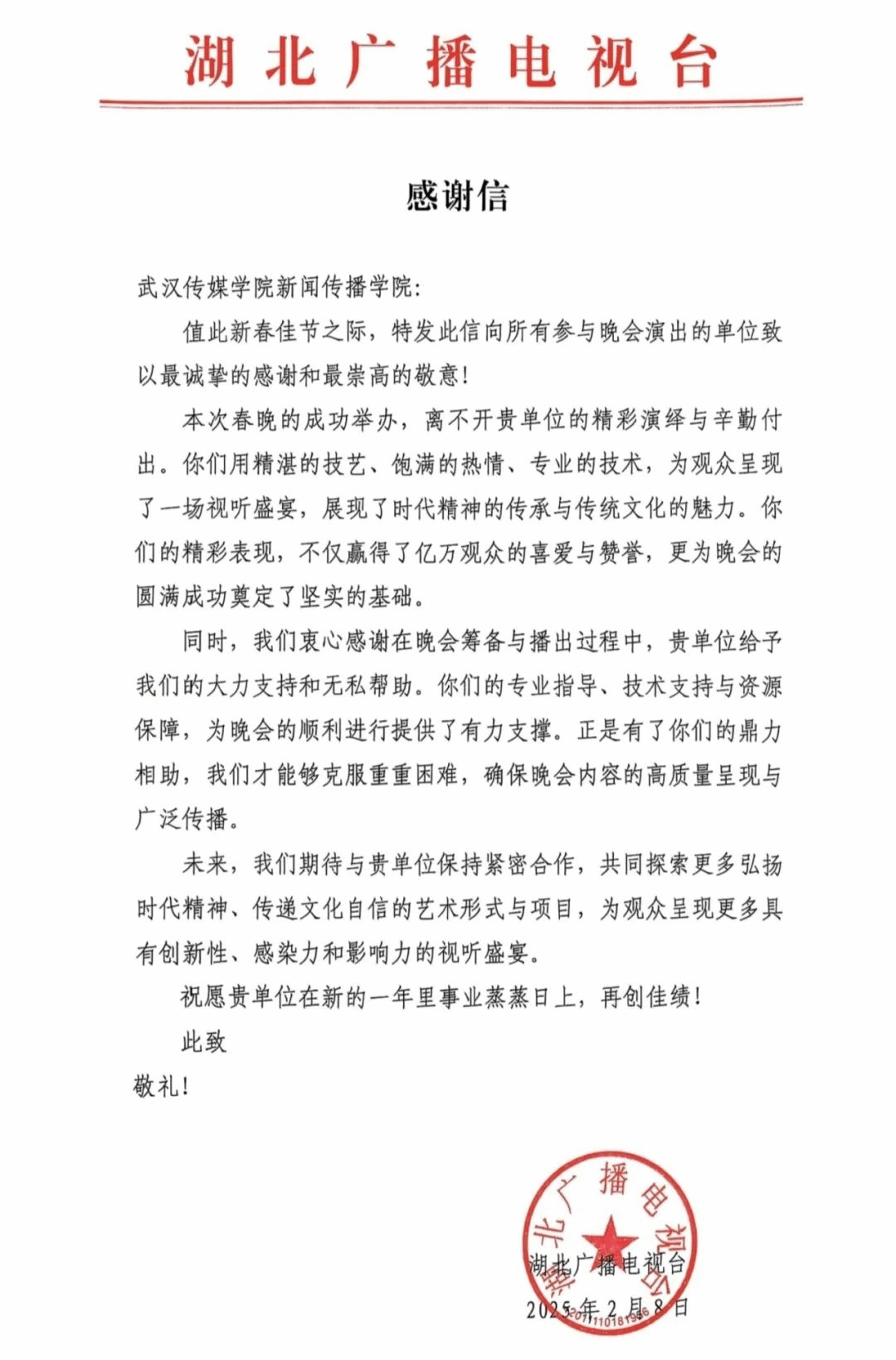 湖北卫视2025蛇年春晚以其独特的荆楚风情和精彩绝伦的节目,为观众们带来了一场极具地域特色的视听盛宴。在这场盛大晚会的筹备过程中,ylg060net永利娱高学子深度参与,助力春晚成功举办。湖北广播电视台为此向我校发来感谢信,对我校实习生在筹备期间的卓越表现给予了高度评价。