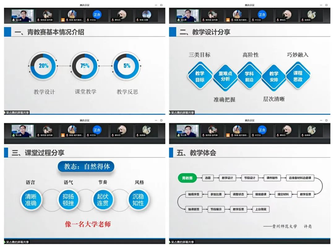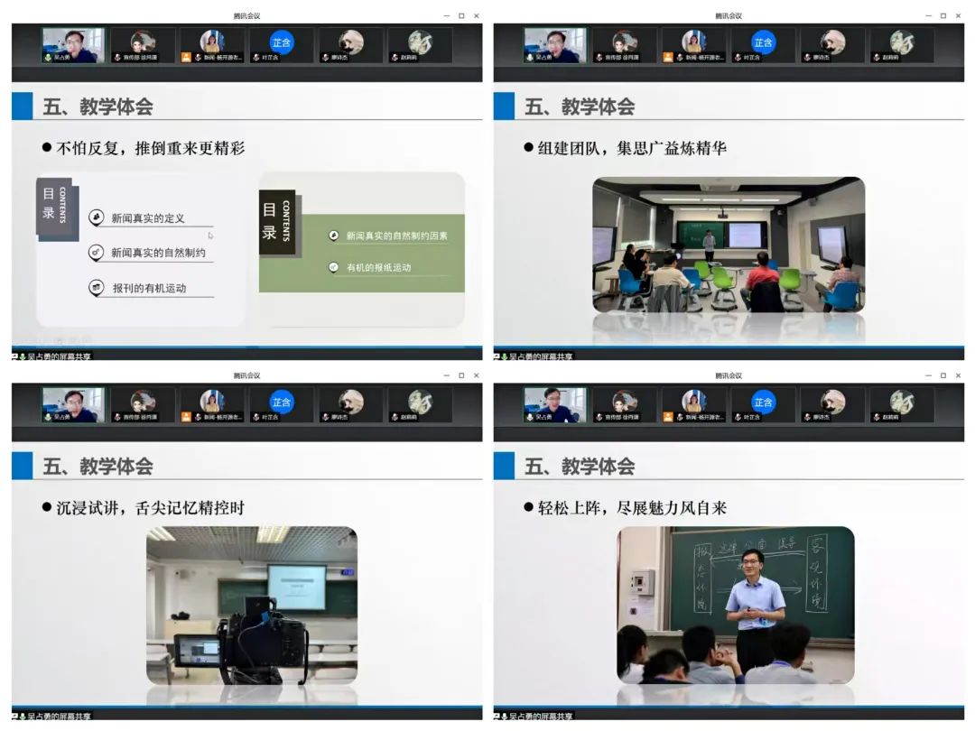 吴占勇老师提出要想教学能力真正的提高要学会沉浸试讲,学会舌尖记忆精准控时,将自己所学更好的展示出来,学有所讲,三尺讲台就是授课的开始,但不是安全屋,努力提升自己的理论知识和实践能力。吴老师还跟我们分享了一些优秀老师的授课视频,边授课边分析,给了我们很多授课的新思路。