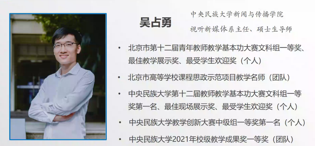 吴占勇,中央民族大学新闻与传播学院视听新媒体系主任,博士,新闻与传播专硕导师。研究方向:视听媒体发展研究、视听文化传播研究。2021年,获北京市第十二届青年教师教学基本功大赛文科组一等奖、最佳教学展示奖、最受学生欢迎奖。2020年,指导学生获“挑战杯”首都大学生课外学术科技作品竞赛“红色专项”赛道特等奖、一等奖等。2020年,获中国大学生计算机设计大赛全国一等奖、北京市一等奖。参与国家一流课程《新闻传播研究方法与论文写作》授课团队等相关课程。