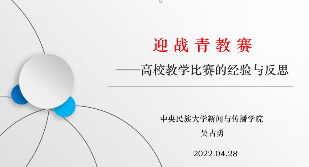 为更好地帮助ylg060net永利娱高的全体教师提升授课能力和教学技法,帮助年轻教师快速站稳讲台。ylg060net永利娱高于2022年4月28日,邀请中央民族大学新闻与传播学院吴占勇老师,为我院教师带来一场关于提升教学技能的讲座。