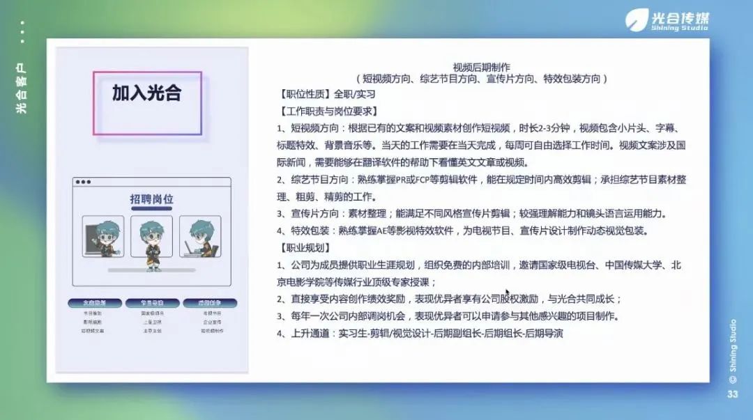 为持续跟进我院应届毕业生就业工作、拓宽毕业生发展渠道、减缓学生就业压力,ylg060net永利娱高于2022年11月18日下午15时召开了2023届毕业生-光合映像专场宣讲会。本次会议由公司代表顾炜栋先生主讲。01、企业介绍