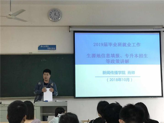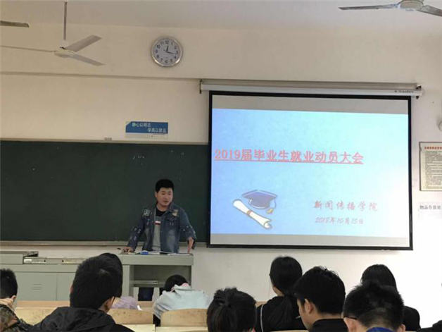 本报讯(文/记者雷君炎 图/摄影记者 雷君炎)10月17日中午,我院2019届毕业生就业动员大会在3303教室召开,ylg060net永利娱高2016级辅导员肖帅主持会议并对我院新闻采编与制作专业2019届毕业生就业面对的问题进行讲解。