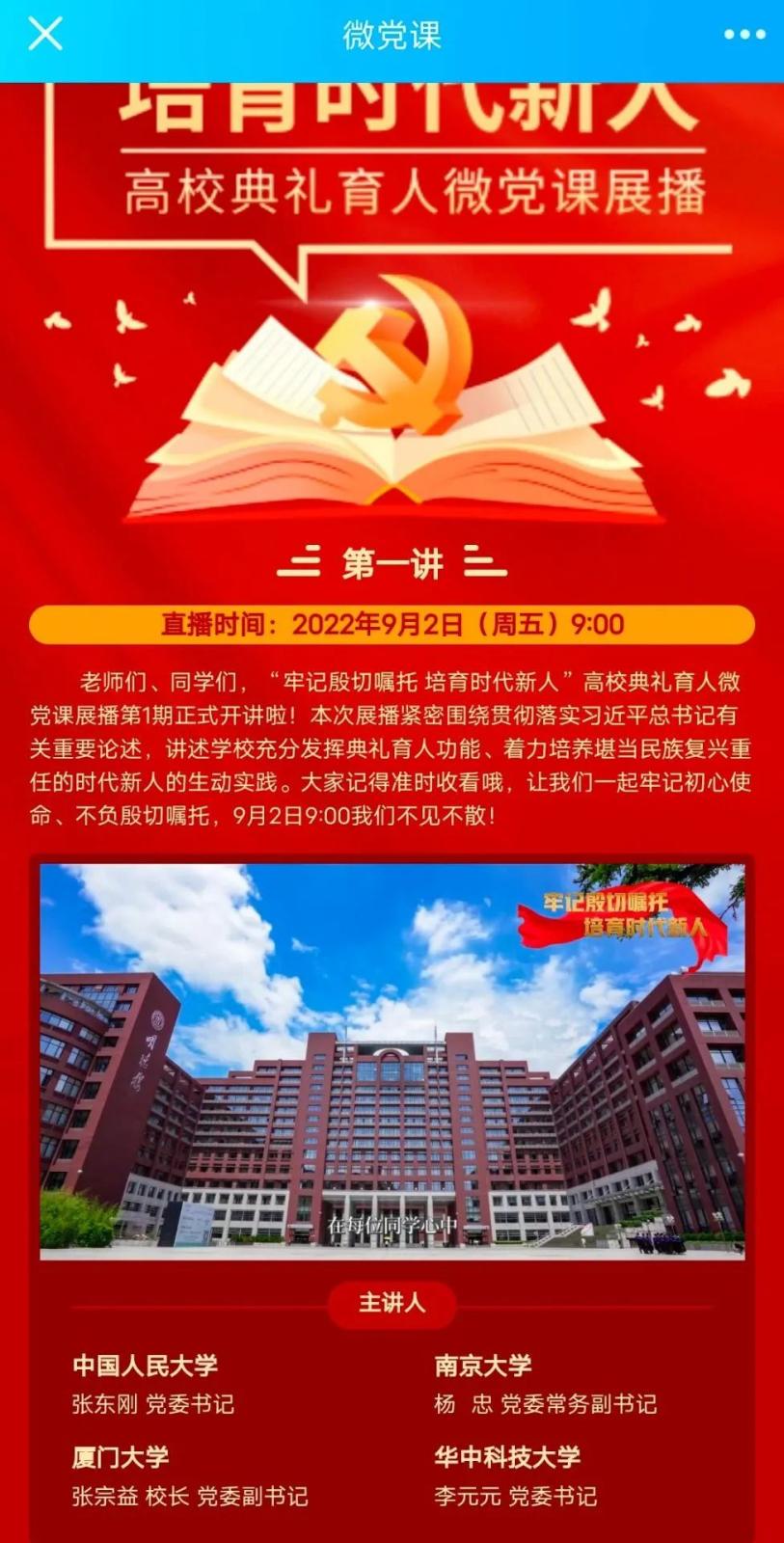 2022年9月2日上午9:00,由教育部思想政治工作司指导,新华网、全国高校思政网承办,新华网、人民网、学习强国、微言教育、全国高校思政网、中国大学生在线、易班网联合播出的“‘牢记殷切嘱托 培育时代新人’高校典礼育人微党课第1期”播出。