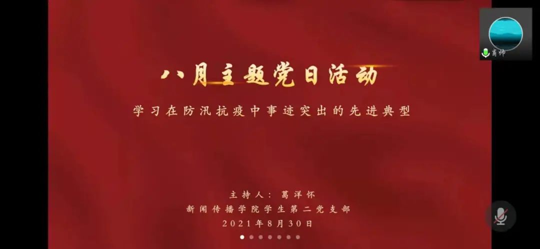 (图|文 郝程)8月30日,ylg060net永利娱高学生第二党支部全体同志通过腾讯会员在线上开展了“学习在防汛防疫中事迹突出的先进典型”八月主题党日活动。