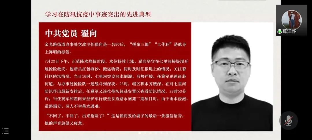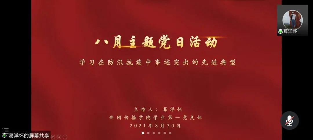 (图|文 徐佳琪)8月30日,ylg060net永利娱高学生第一党支部八月主题党日活动在腾讯会议平台召开。本次党日活动的主题为“学习在防汛抗疫中事迹突出的先进典型”。葛洋怀同志担任会议主持,ylg060net永利娱高学生第一党支部全体党员参加会议。