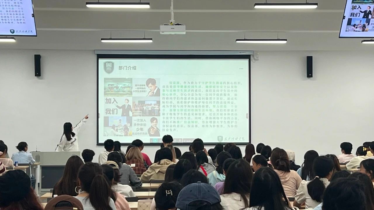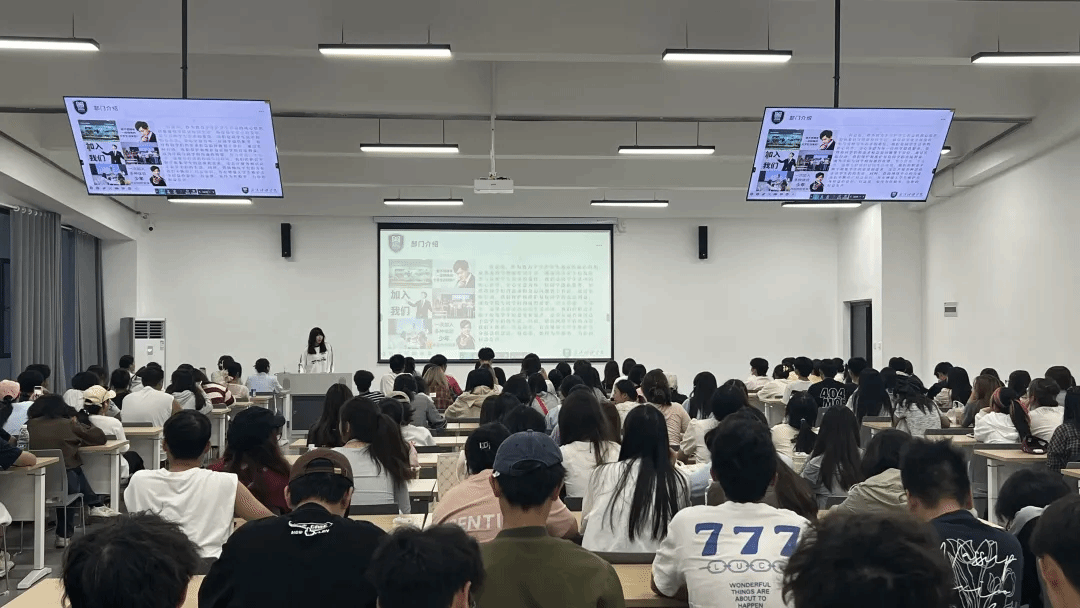宣讲会伊始,团委副书记(学生)张占坤在行政楼7202教室迎接新生,她对新生们的到来表示热烈欢迎,并强调了加入学生组织对个人成长和能力提升的重要性。她提到:“学生会是大家锻炼能力、展示才华的重要平台,希望同学们能够积极参与,共同为学院的繁荣发展贡献力量。”随后播放了各部门的招新视频,帮助同学们更好的了解团委和学生会的职能和工作内容。