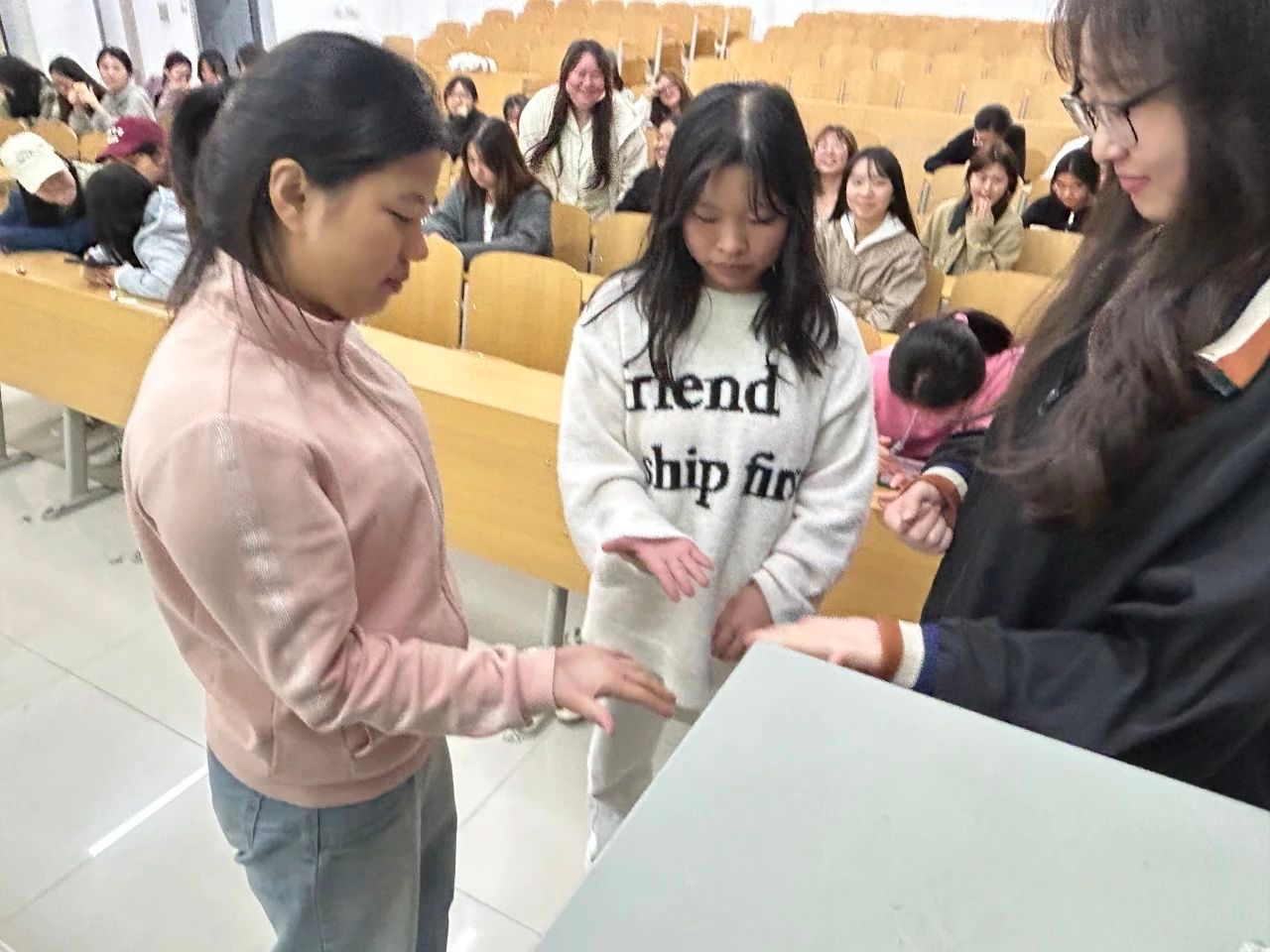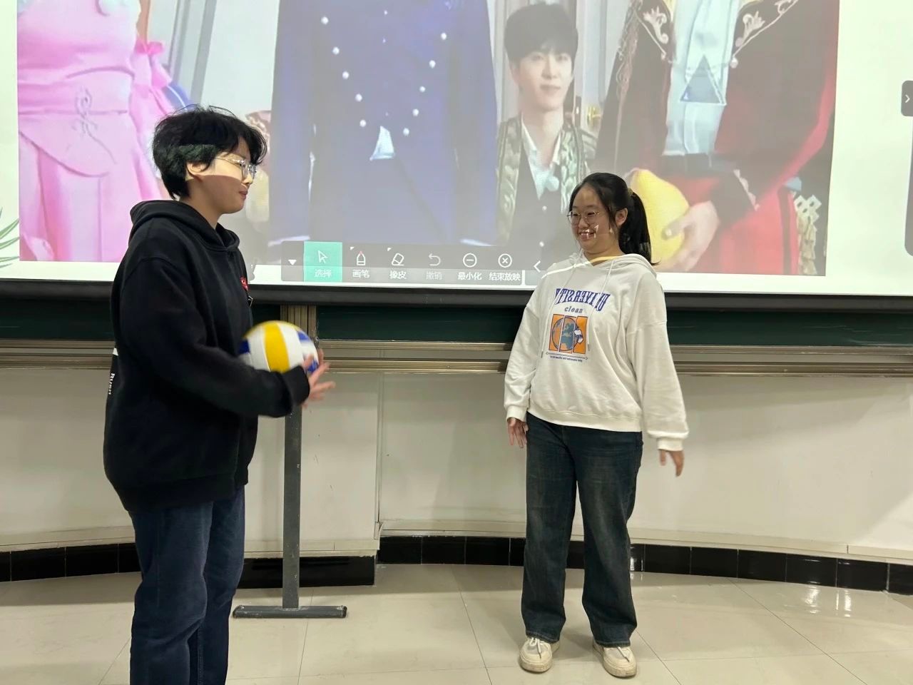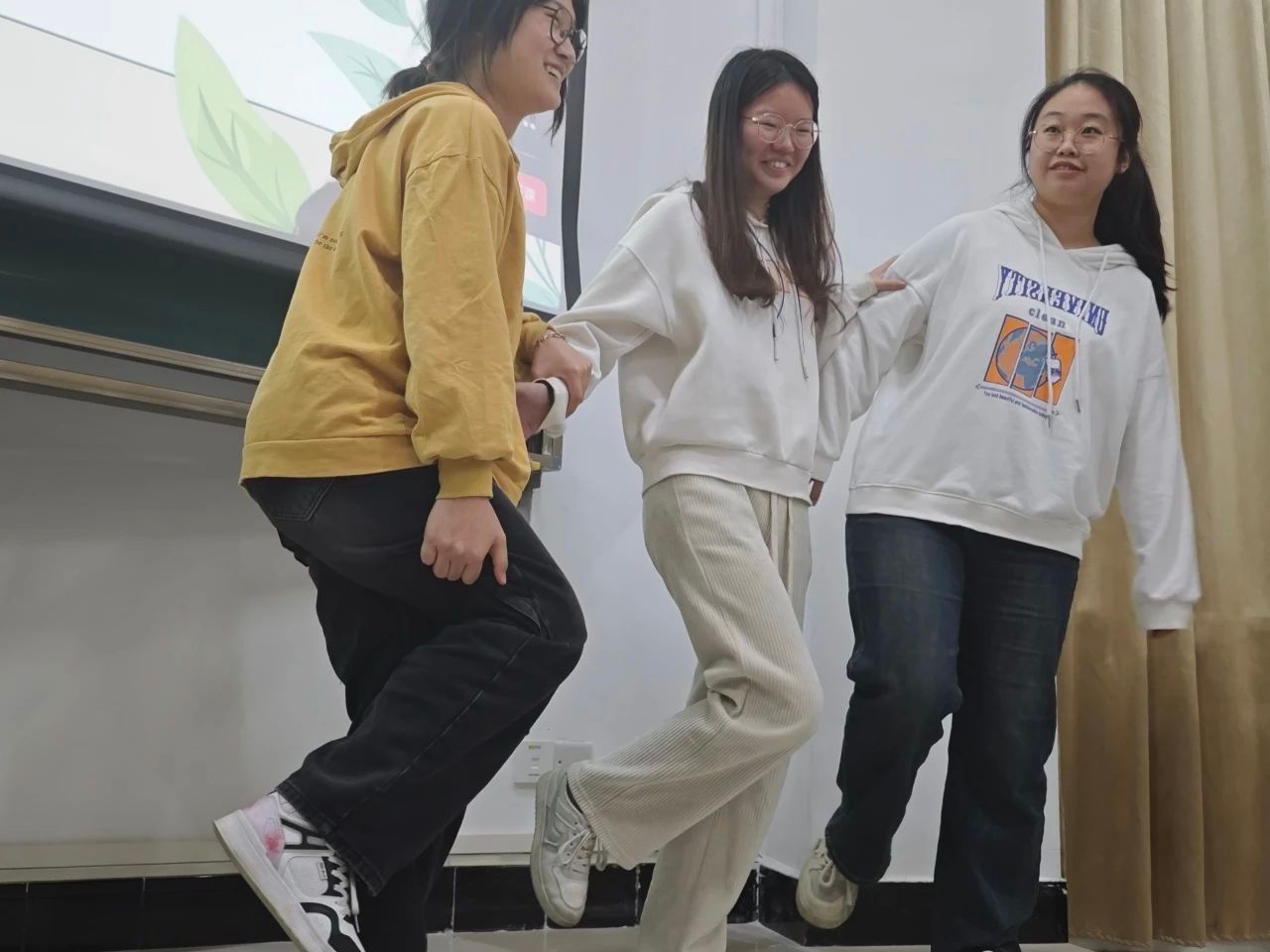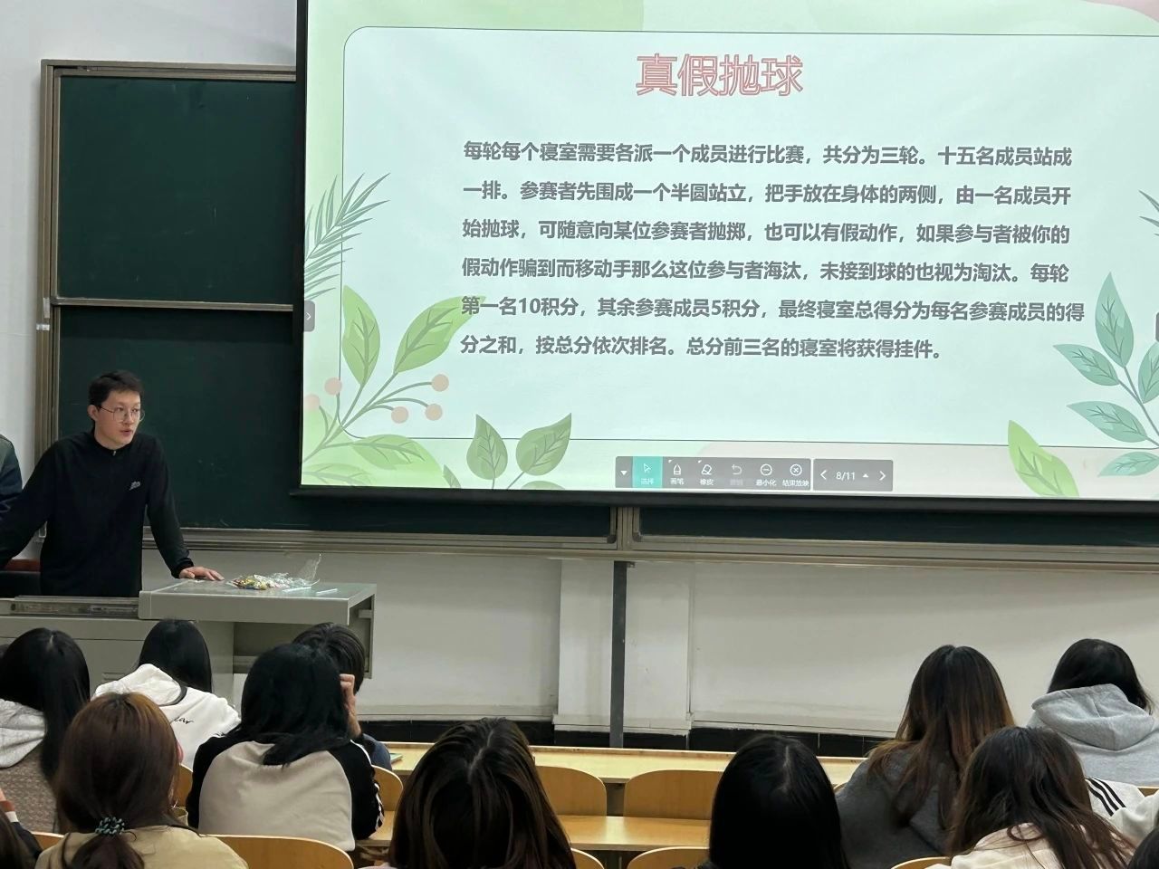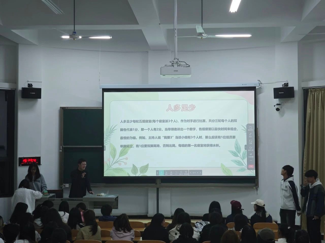 在活动之中,来自各个寝室的代表们以饱满的热情积极参与这场游戏,而坐在台下的室友们也被如此精彩的活动紧紧扣住心弦为他们加油鼓气放声呐喊。