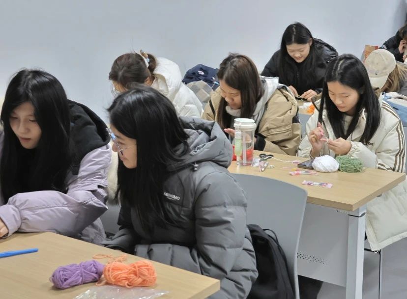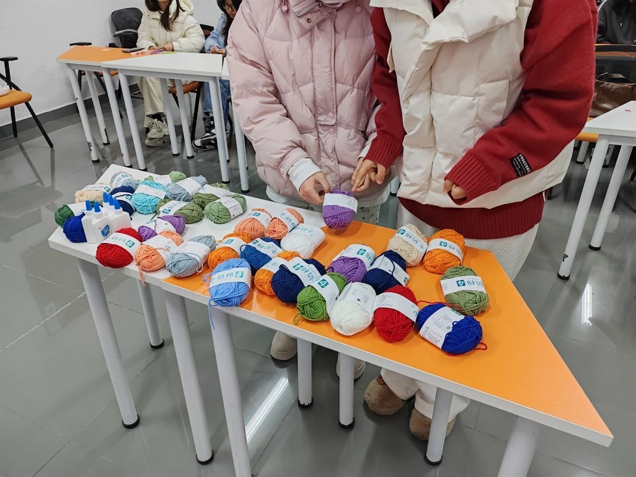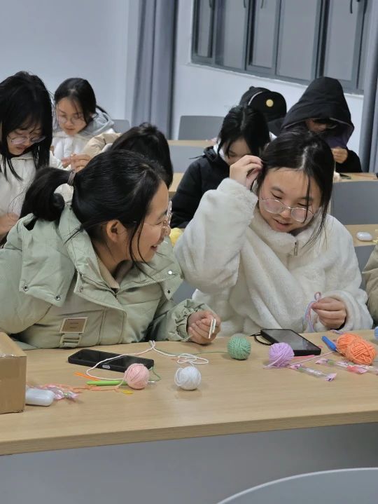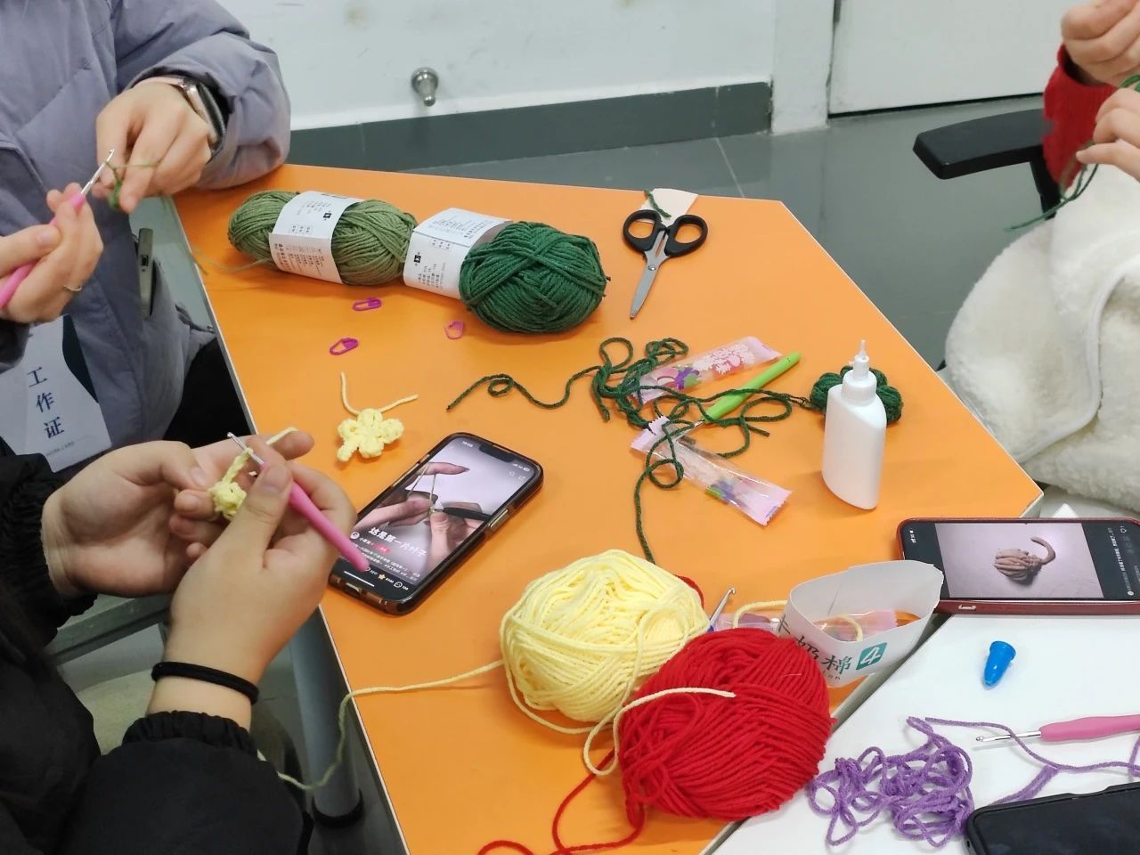 现场气氛热闹而温馨,同学们相互交流钩织技巧,分享创意灵感。