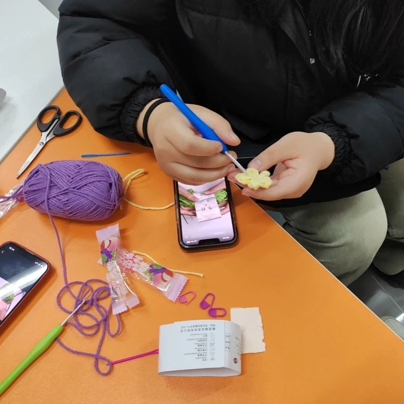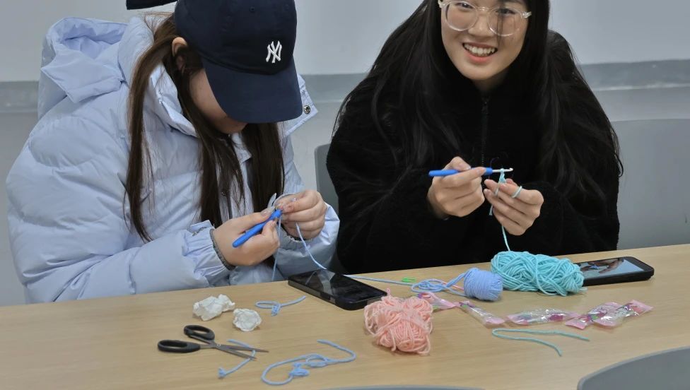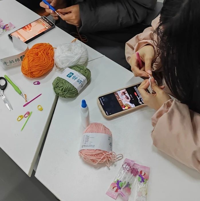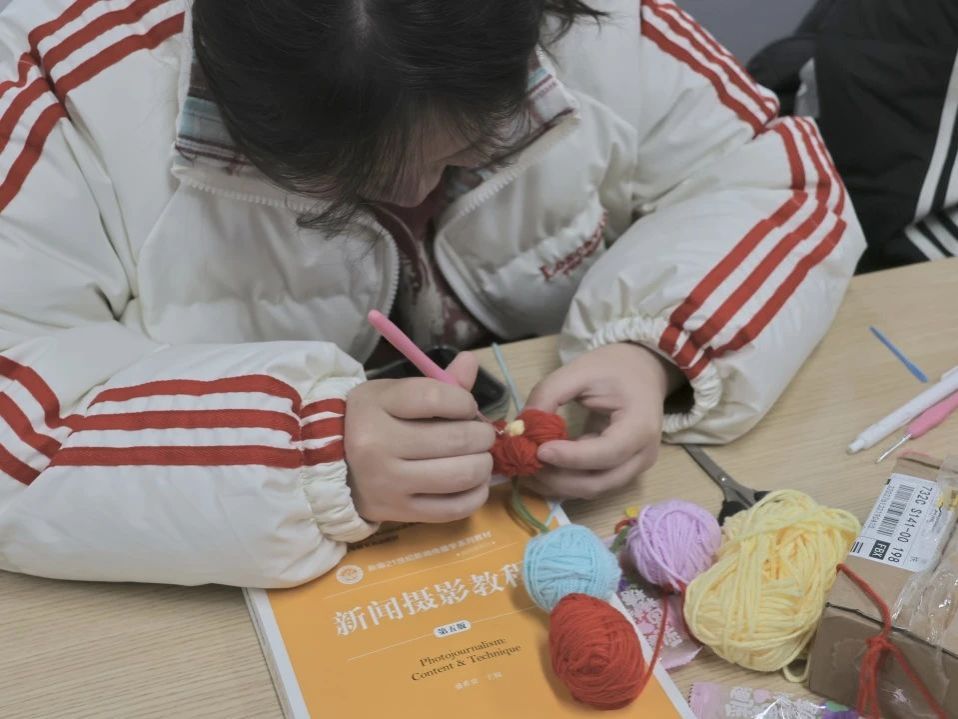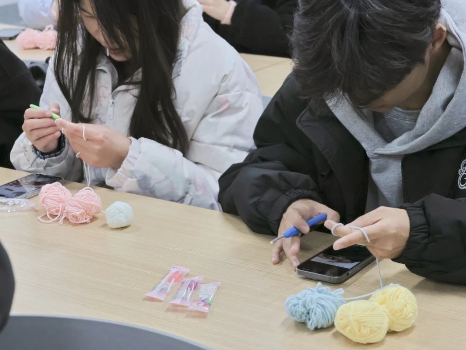 现场气氛热闹而温馨,同学们相互交流钩织技巧,分享创意灵感。