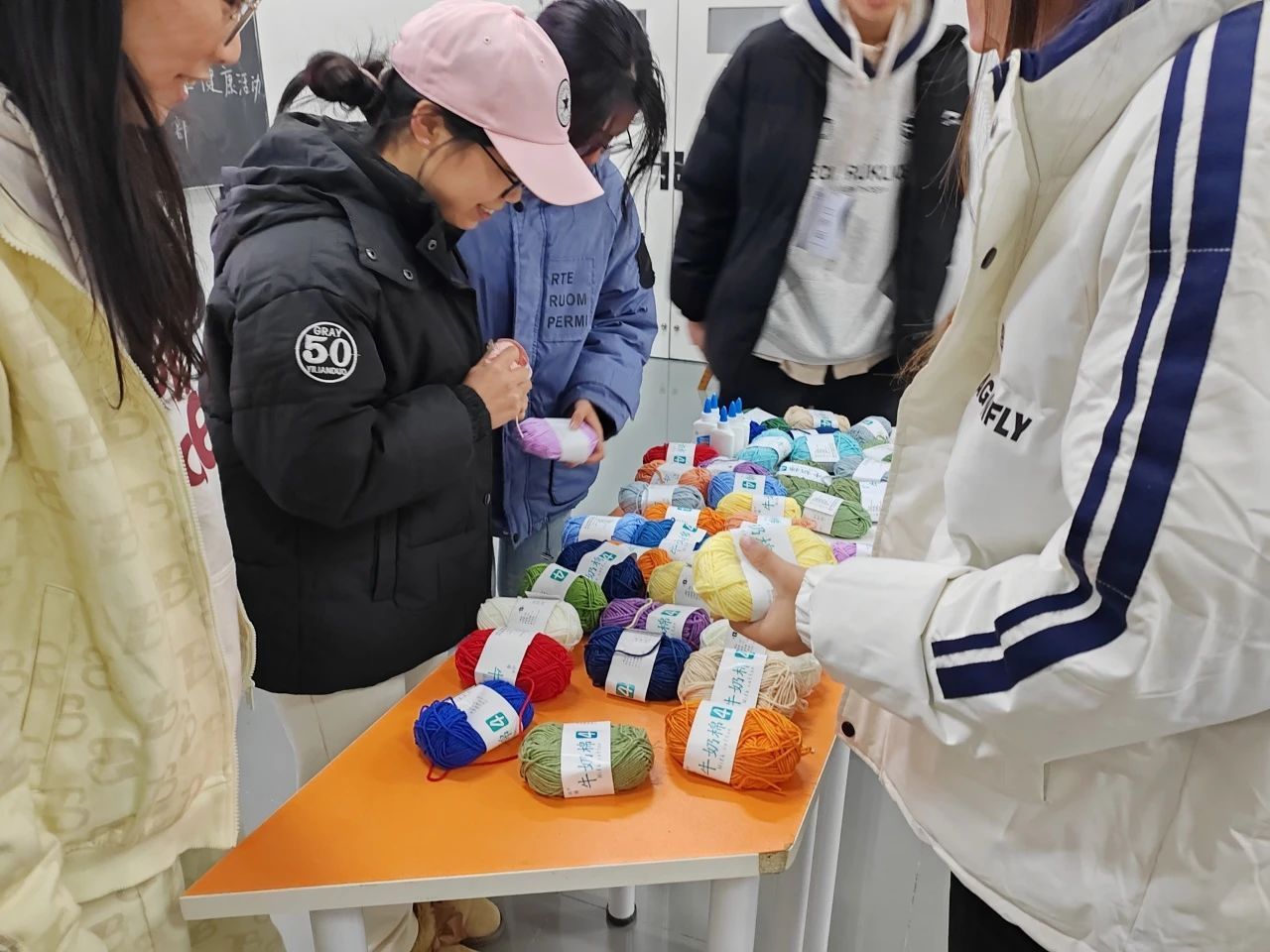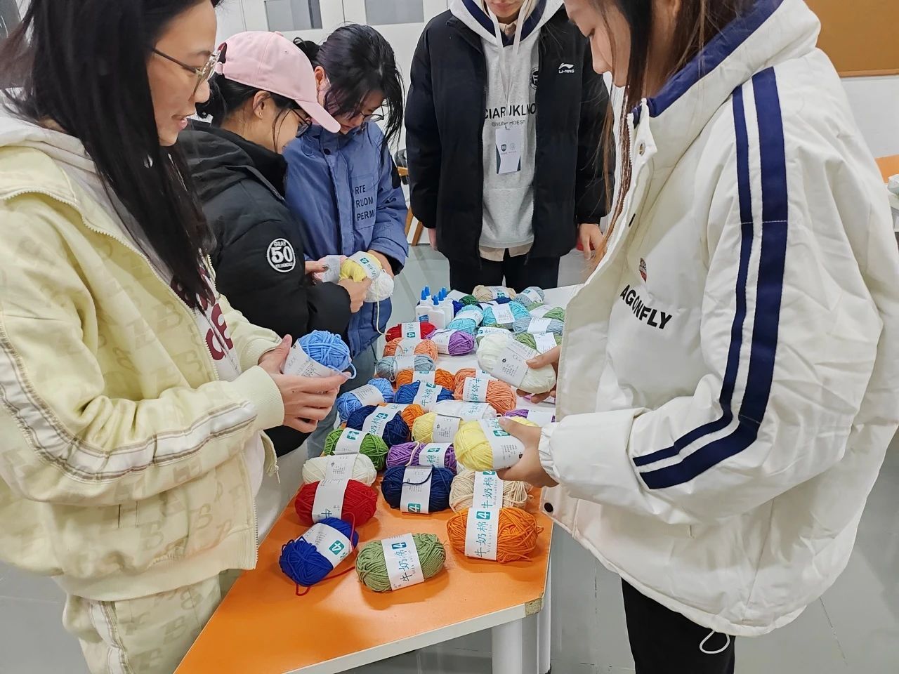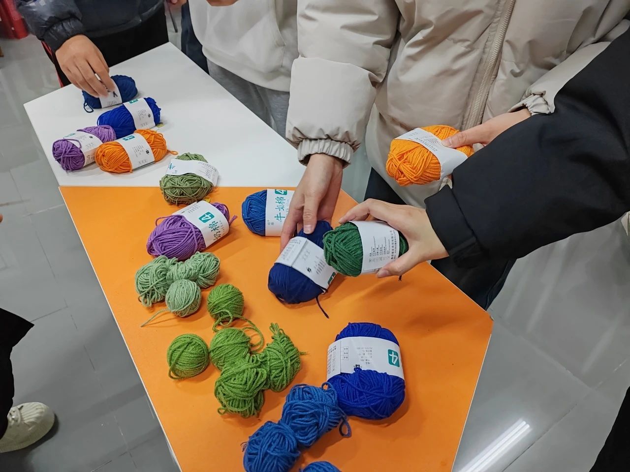 同学们积极参与,氛围热烈。游戏结束后,同学们按照排名挑选心仪颜色的牛奶棉线,开启钩织DIY之旅。