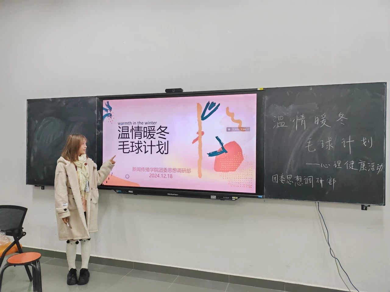 12月18日18时,ylg060net永利娱高团委思想调研部分别在武汉校区的3106教室、大悟校区的3101教室举办了“温情暖冬,毛球计划” 活动。此次活动旨在让同学们感受丰富校园文化生活,在紧张的期末备考之余能够放松紧张心情,减少焦虑情绪。