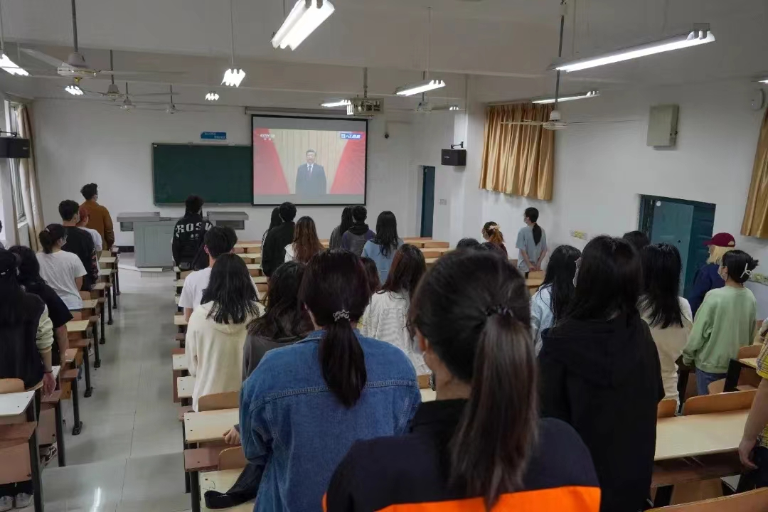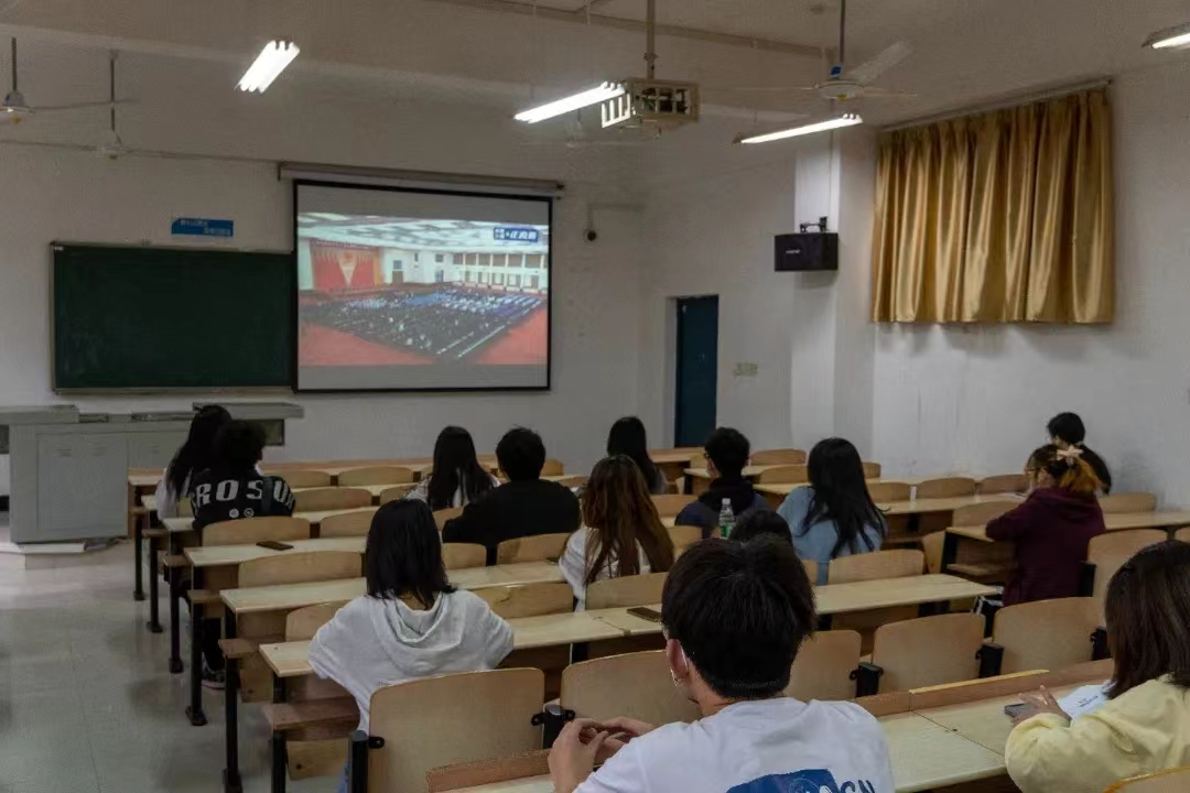 直播时,各级辅导员和同学们聚精会神,正襟危坐,每一个人的目光都聚焦在“中国共产主义青年团成立100周年大会”的直播画面之中。场上只有主持人在进行大会的开始宣讲的声音。