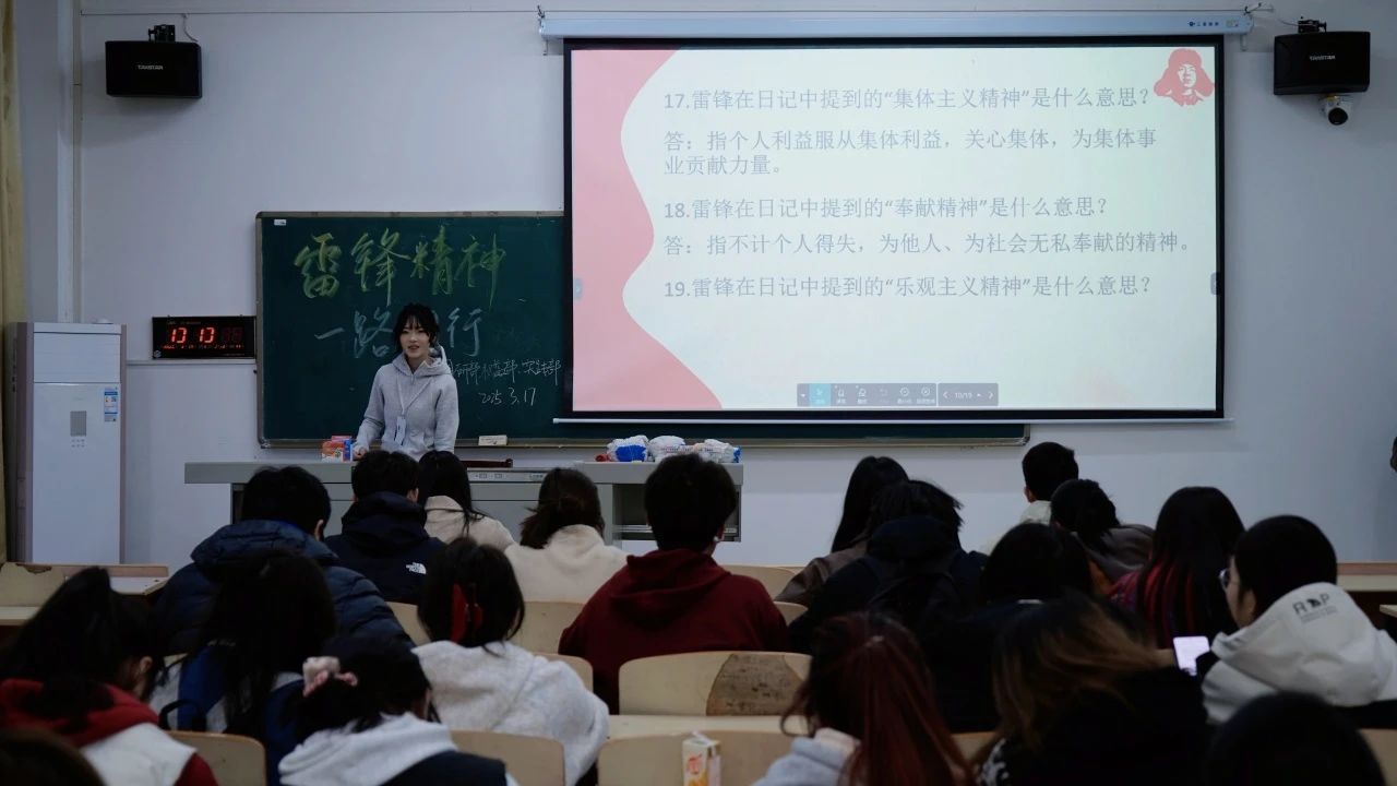 活动开始,工作人员组织同学们自由组队,并通过PPT随机展示题目,开展“雷锋知识问答盲盒挑战”。同学们踊跃抢答,在互动中深入了解雷锋事迹及精神内涵,现场气氛热烈。