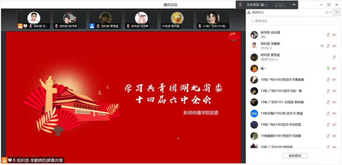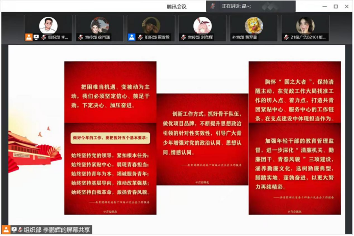 本次会议秦书记带领同学们深入学习了共青团湖北省委第十四届六次全会工作报告,对“关于做好庆祝建团100周年有关工作”做出了具体要求。秦书记表示共青团的活动开展要聚焦到为党育人的任务上,做优“青年大学习”、“三下乡”等项目品牌,发挥其阵地作用,不断提升思想政治引领的针对性和实效性,引导学生增强对党的政治认同、思想认同和情感认同。