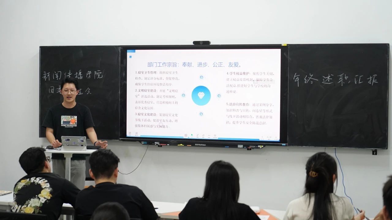 监察部展示了模拟新闻发布会以及普法情景剧等活动的成果,秉持严谨负责的工作态度,严格监督学院各项事务的开展,确保各项规章制度的严格执行,为学院营造了风清气正的环境,保障了学院工作的公平、公正、公开。